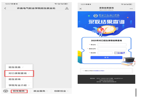 进入“许昌电气职业学院招生就业处”微信公众号,通过左下角的“招生服务—对口录取查询”,输入考生号和身份证号查询录取结果。