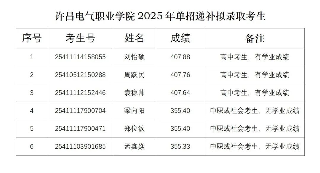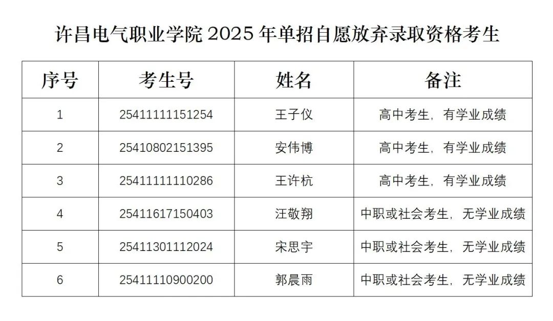 根据《许昌电气职业学院2025年单独招生工作实施方案》相关规定及工作流程,经考生本人申请、招生就业处审核,现对截至2025年4月27日18时自愿放弃录取资格的6名考生信息予以公示,名单如下: